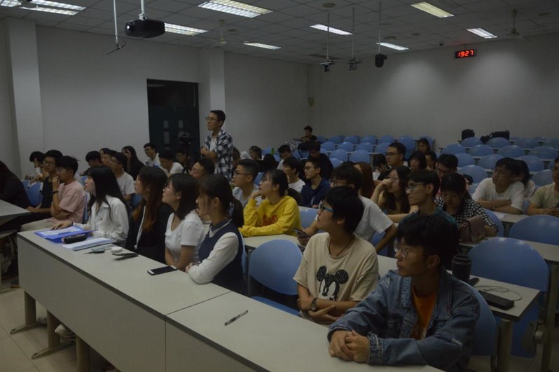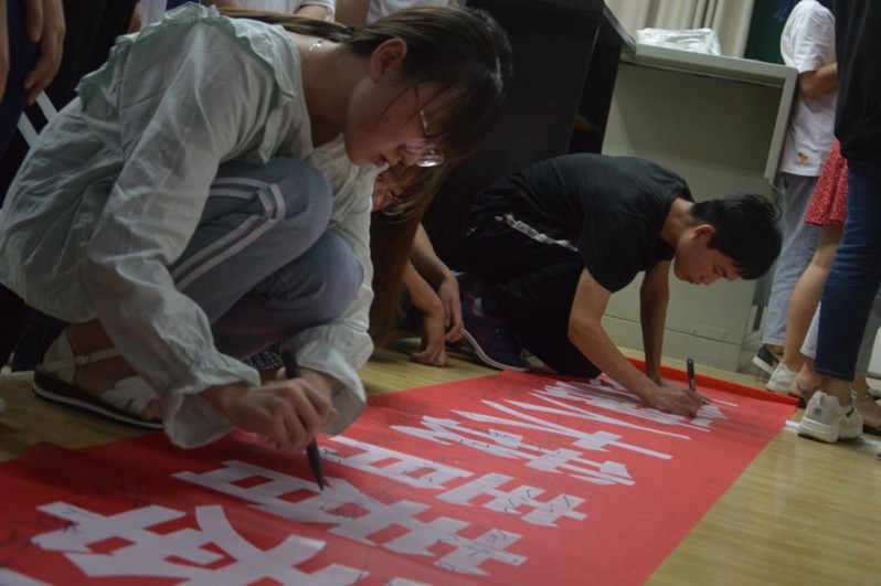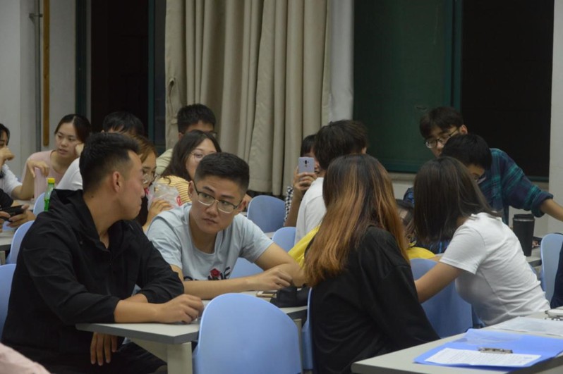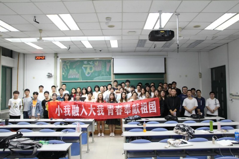 9月26日晚,活动伊始,本次的主持人崔静带领同学们重温70年前的开国大典,视频是由俄国摄影师用彩色胶卷拍摄,将俄语专业的魅力完美地展现出来。接下来,活动围绕“社会实践和当代老员工责任与担当”这一话题,邀请到了来自中国石油大学南衫支教队、Dream-Seeker实践队及薪火相传实践队的三名队员,由他们依次讲述活动经历并与在座同学们交流了感受。正如主持人所说:“一个有责任有担当的社会主义青年,就应该把青春奉献给祖国,把汗水洒遍大地”。然后,各个团支部的成员以小组的形式积极踊跃地分享了自己的实践趣事,总结自己在活动中遇到的问题。交流过后,参加活动的各位同学在主持人的带领下,全体起立并庄严宣誓,所有人举右手、握紧拳,喊出了青春献给祖国的心愿,宛如入党誓词的宣读,饱含着青年人对祖国的热爱。过后,三个支部的同学集体在条幅上写下了对祖国的寄语并在黑板上画出了对祖国的祝福,以抒发“小我融入大我”的爱国之情。