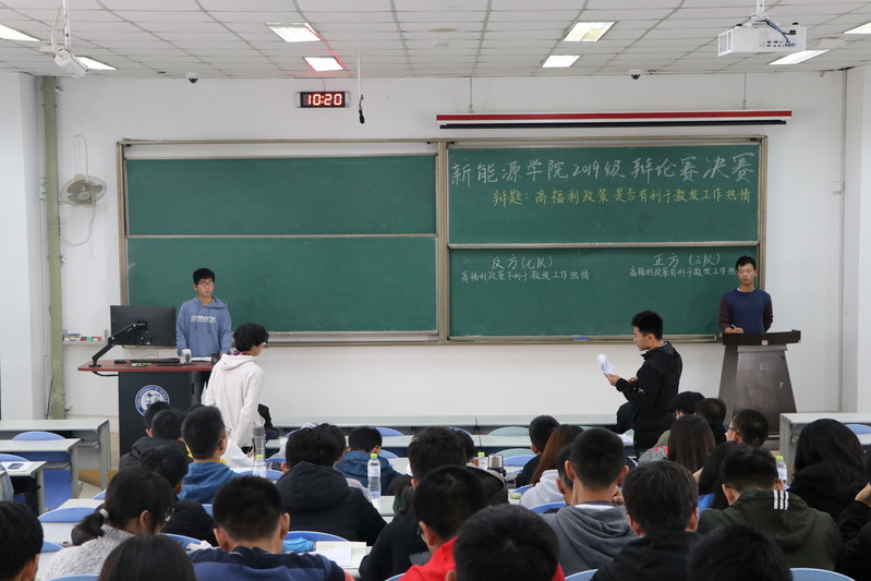 本次辩论赛分为初赛,半决赛,决赛共七场举办。参赛队伍分别围绕宽松式管理是否有利于老员工学习、网络对老员工的利或弊、高福利政策是否有利于激励工作热情等社会热点辩题展开激烈辩论。本次辩论赛采用常规辩论赛赛制,但在其中添加了观众提问的环节。首先进行一辩立论,其对整个赛程起了决定性作用;接下来二三辩攻辩,在攻辩环节中各队伍的二三辩选手唇枪舌战,互不相让;最后添加的观众提问环节让整场辩论锦上添花,观众的思维方式也会让队员们耳目一新。在最终决赛中,由电气工程及其自动化三班、四班组成的八队与能源与动力工程一班、二班组成的三队进行辩论,在本场辩论中,电气三班的马永龙同学这么说:“高福利待遇是很好没错,可以让员工感觉到更暖心,但是别忘了,长久以往,这样下去,高福利待遇带来的不是更高的工作热情,而是更大的危机。”马永龙同学的发言为其队伍后续的攻辩环节奠定了基础,为其获得最终的冠军提供了有力保障。