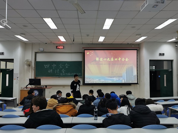 活动伊始,班长赵俣名向员工们介绍党的十九届四中全会的主要议程、开展背景及开展意义,并组织员工们对党的四中全会开展的意义与作用进行讨论与总结,发表各自的看法,让员工们深入的了解党的十九届四中全会的精神。接着,组织委员邹英培向员工们介绍了四中全会最重要的成果,“党的四中全会全面回答了‘在我国国家制度和国家治理上,应该坚持和巩固什么、完善和发展什么’这个重大政治问题”。最后,由团支书李君婵发表对本次活动的总结“经过了本次党的四中全会研讨会,我相信同学们一定了解了到了中国特色社会主义制度和国家治理体系的显著优势,为自己生活在这样一个强大的国家感到自豪,也更加坚定了要为这个日益强大的国家努力奋斗的决心。”