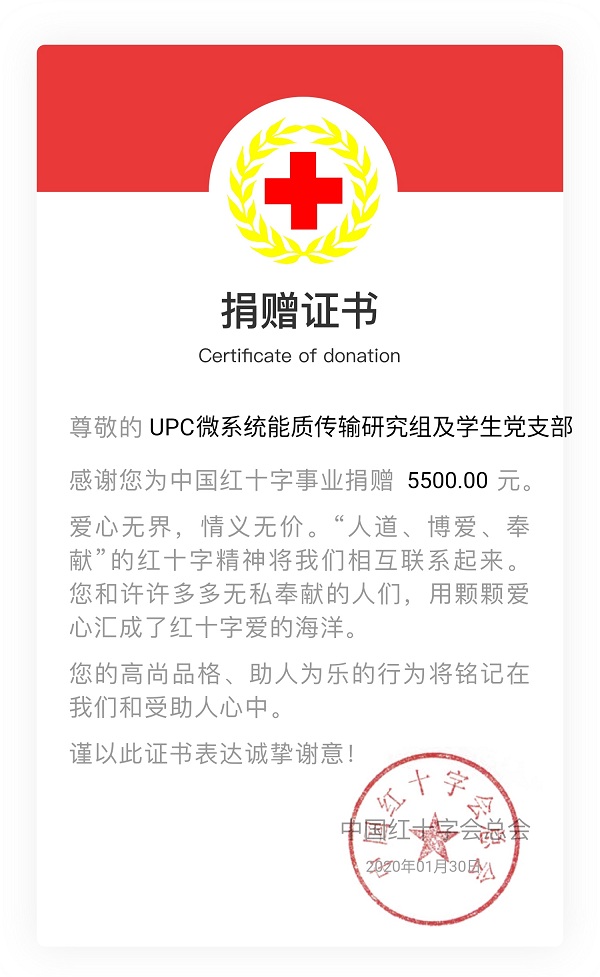 1月30日,XC体育微系统能质传输研究组师生及XC体育能动研究生第一党支部研究生向中国红十字会捐出5500元,用于新型冠状病毒防治,并在当天收到了来自中国红十字会的捐赠证书。