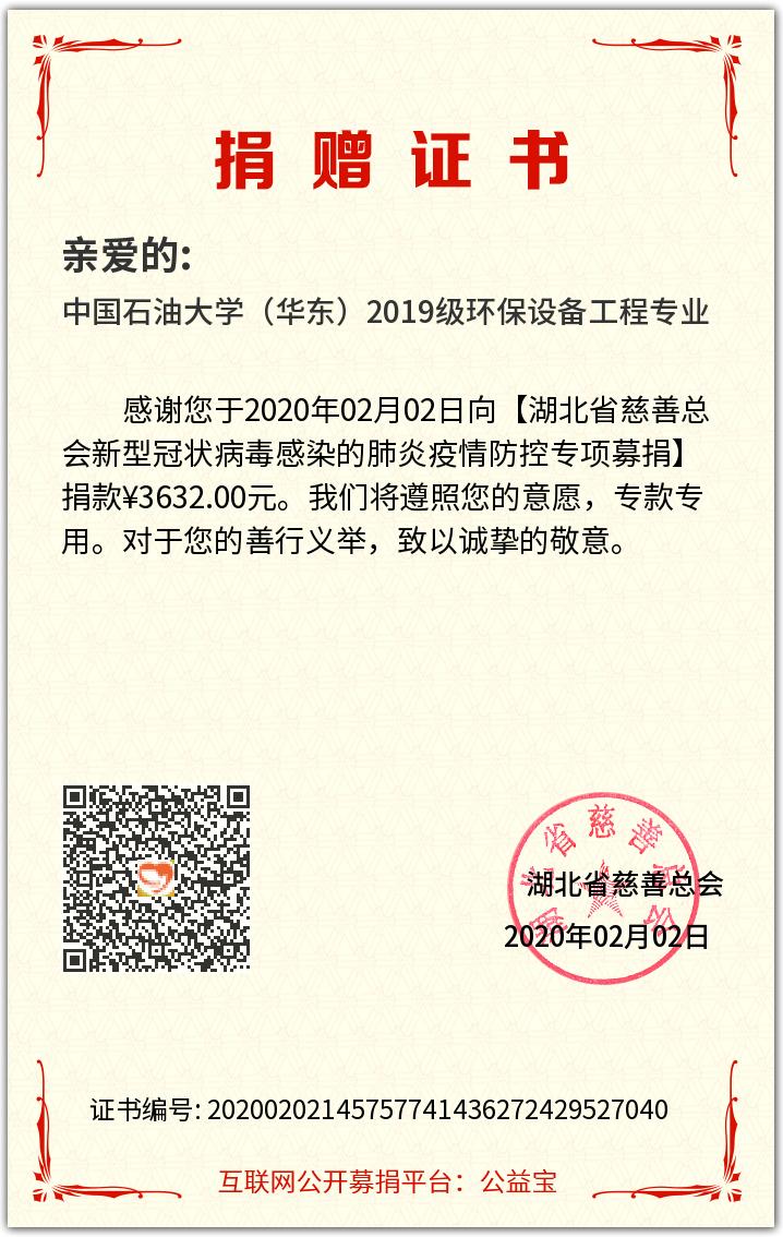 为向当前武汉疫情防控工作贡献力量、提供帮助,公司环保设备工程专业2019级员工自主发起了集体捐款活动,为抗疫前线蓄力,为武汉加油。