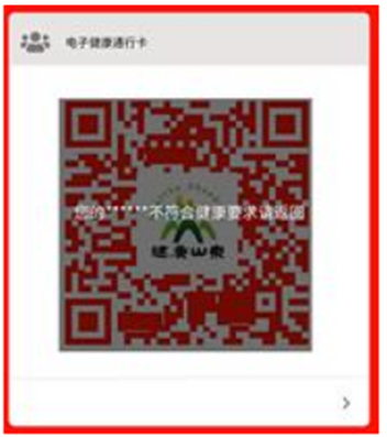 3.电子健康通行卡生成。签发后电子健康通行卡将根据核签情况呈现三种颜色之一,即红色、黄色、绿色,其中红色代表不满足出行条件,应向所在社区(村)或单位报告,必要时通报当地疫情防控部门;黄色代表需要信息进一步完善核实后通行(如测量体温等),或者健康通行卡已过期、需重新申报;绿色代表可以直接通行。电子健康通行卡样式见附件。
