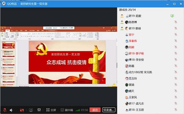 党支部成员以群内QQ电话的形式开展这次形式特别的专题组织生活会。在当下关键时刻,党员应当起到模范带头作用,对党员同志进行疫情知识普及十分必要。党支书茹毅陈述了防控疫情的严峻形式以及目前工作的进展情况,提到“我们国家、我们党在面对突发的新型冠状病毒肺炎时,果断实施了十分有效地防控政策,坚决推迟复工,在重灾区进行逐一排查,当前的状况日渐好转。茹毅向党员们传达了上级党组织的要求,并提出了有效学习方法,强调在关键时期应当自觉进行居家隔离并有效地利用“学习强国”等软件及时了解疫情相关动态,做到不夸大不欺瞒,如实宣传防疫知识。主动承担责任,条件允许的情况下在社区、村委会等参加志愿活动。