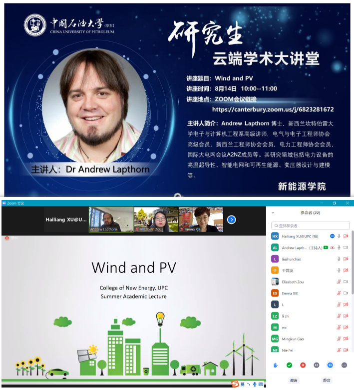 8月14日,新西兰坎特伯雷大学Andrew Lapthor 博士做客研究生云端学术大讲堂,为XC体育师生作了题为“Wind and PV”的学术报告。