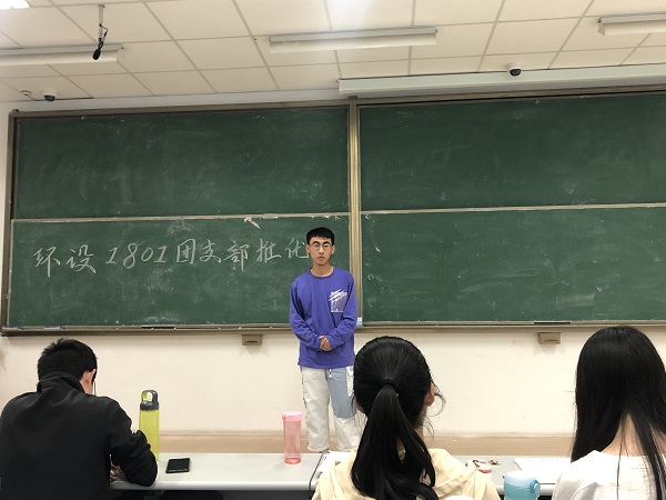 此次会议由环设1801团支部书记王玉主持,会议伊始,王玉对推优工作的具体流程作出详细解释,并指出其作为党团衔接纽带的重要意义。随后,环设1801团支部成员李阳、杨淇和王玉婷三名推优候选人根据抽签顺序依次上台发表竞选演讲。他们分别从自己的思想近况、日常态度、入党动机及决心等方面展开陈述,王玉婷表示:“中国共产党的为人民服务的宗旨是鞭策我积极投身公益活动、不断向前的不竭动力”。演讲结束后,王玉组织全体团员对三位推优候选人进行无记名投票,大会工作人员收集选票并进行唱票统计,经过民主投票及支委会议的讨论最终确定了王玉婷和李阳两名团员成为本学期的推优对象。