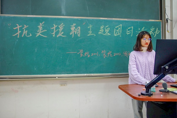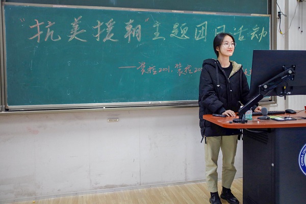 活动伊始,装控2001班团支书姚梦晗以一首《中国人民志愿军战歌》开始本次主题“抗美援朝”的讲解。在讲解过程中,她着重讲解了“抗美援朝”中极具代表的“上甘岭战役”。随后她播放了与抗美援朝主题相关的短视频--《那年那兔那些事儿》。观看视频过后,装控2001员工刘笑宇,张涵川发表了观后感:“我们感受到那时志愿军战士坚定的心,他们是最可爱的人。”该部分末尾装控2001班团支书姚梦晗总结了抗美援朝为一次“山河已无恙,英雄须铭记”的伟大战役。