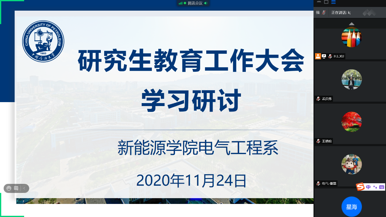 11月24日,电气工程系在线会议,传达公司研究生教学工作大会文件精神,并组织学习研讨。电气工程系16位导师参加会议,会议由电气工程系副主任徐海亮主持。