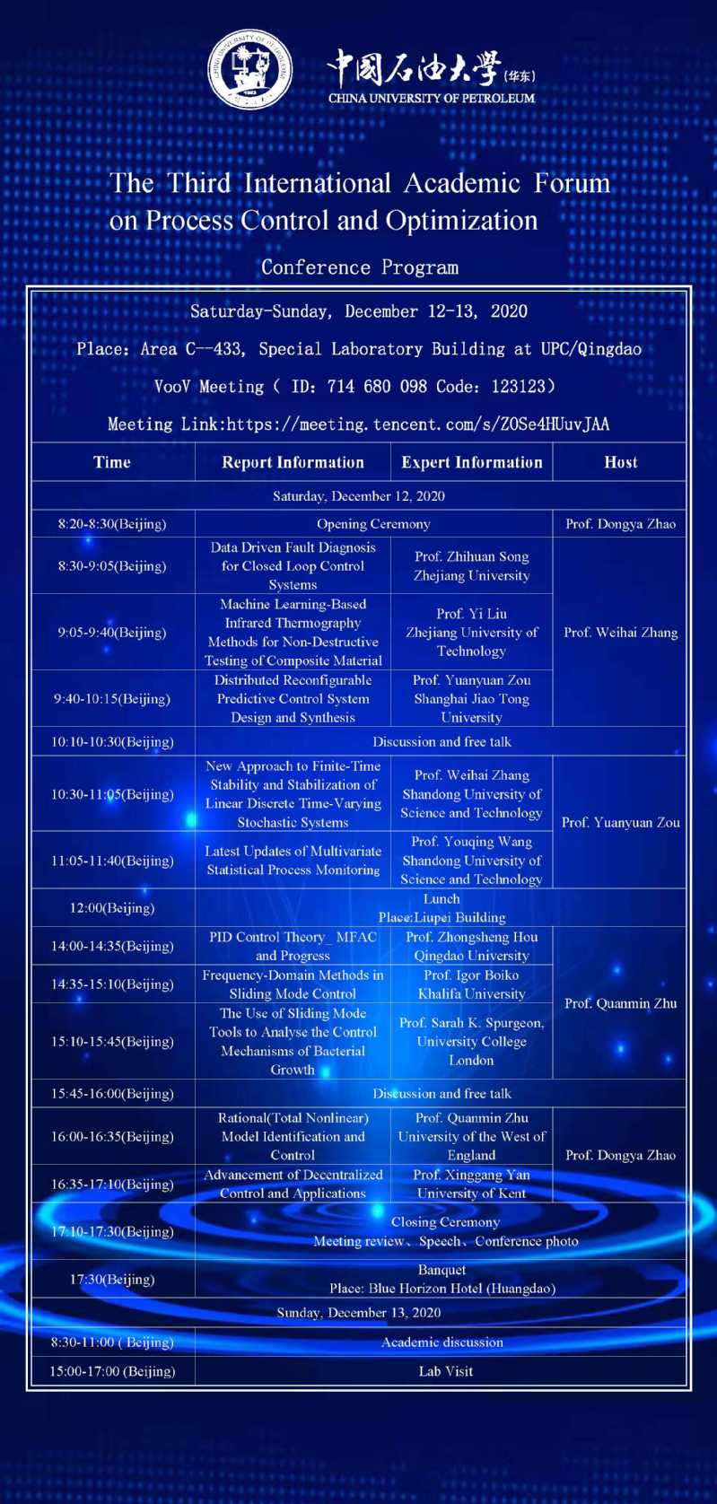由王宽诚教育基金会资助,XC体育承办的“第三届国际过程控制与优化学术前沿论坛”将于2020年12月12-13日在青岛召开,会议采用线上和线下相结合的方式。