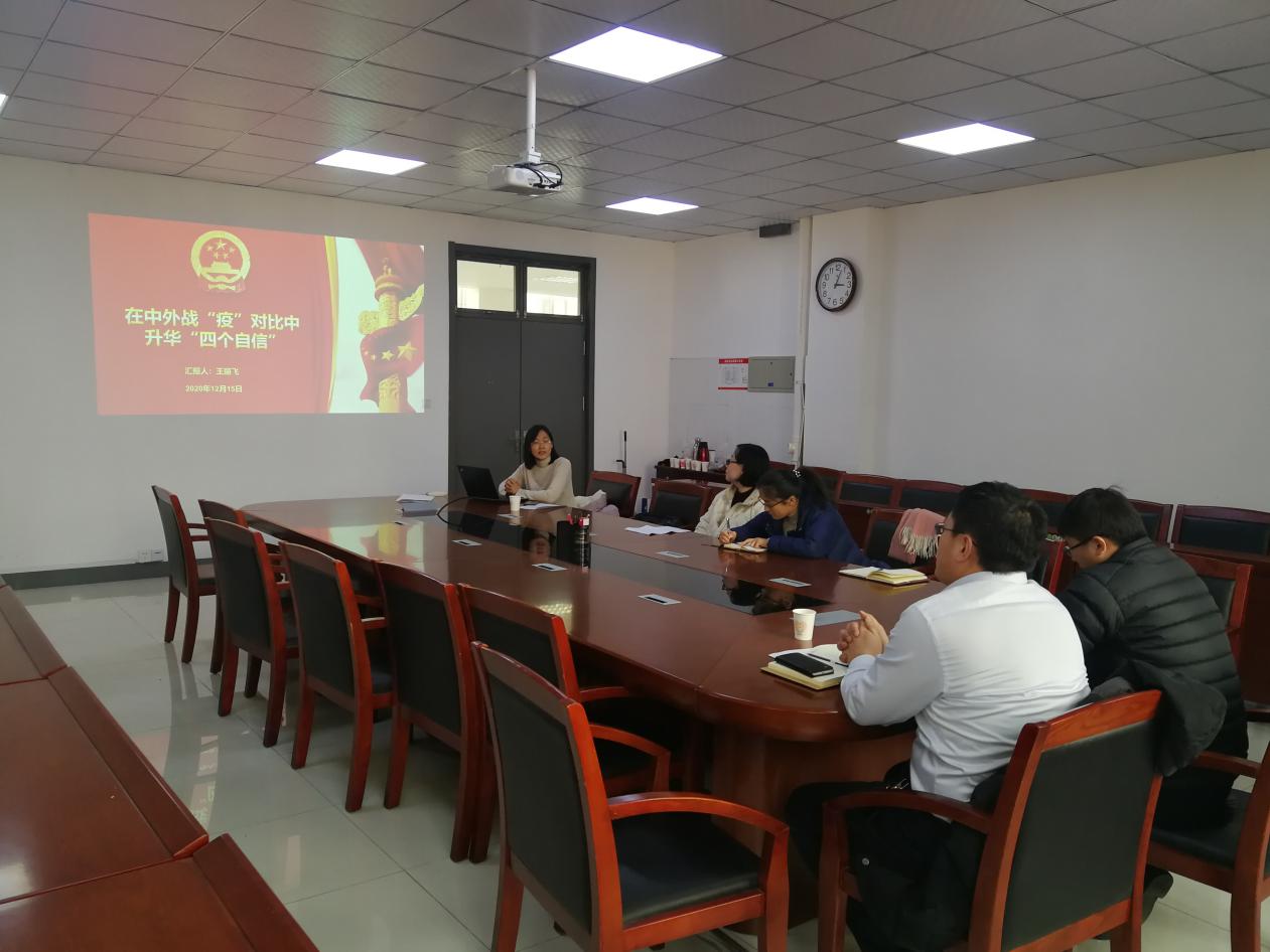 2020年12月10日下午,实验中心党支部在特种楼C433会议室开展了“支部书记讲党课活动”。支部书记王丽飞同志以《在中外战“疫”对比中升华“四个自信”》为题讲微党课。