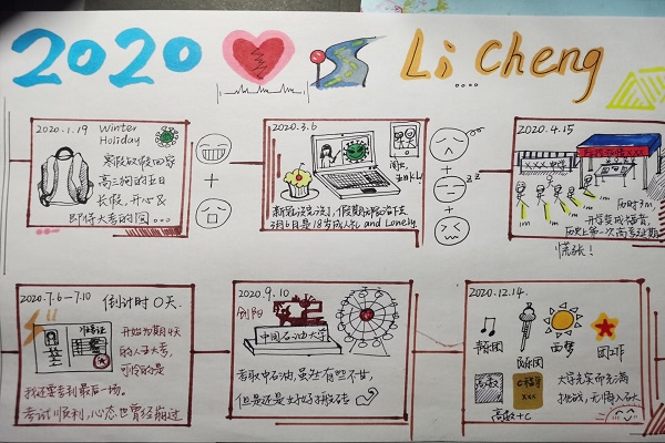 本次活动作品要求为设计2020年情感变化及其经历。作品提交分为线上提交以及线下提交两个阶段。线上提交时间为12月10日至12月18日,此阶段参与活动人员将自己描绘的心路历程图发送至XC体育心理健康工作站公众号,由心站成员负责审核工作。据统计,心站所收到的作品大都围绕新冠肺炎、居家隔离、网课学习、老员工活等展开,参与活动者的心路历程图主要由图像以及文字构成,以手绘或者作图软件的方式展现。对于不同年级,作品内容也不相同,大一以高考经历为主,大二则以四六级备考经历为主,大三大四主要是考研以及找工作的经历描绘。线下提交时间为12月20日,此阶段参与活动人员前往17号楼活动室分享并描绘自己的2020年。装控2004班曹梦晓在活动结束后表示:“此次‘2020心路历程图’描绘活动让我能够总结过去,展望未来。对自己2020全盘审查,使我更加了解自己。在这特殊的一年的故事中,记住的不仅仅是灾难,也更知道:生活总是要充满希望,2020没有那么糟。”