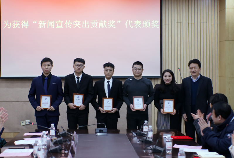 冯宝鹏为获得“新闻宣传先进集体”的院系单位和员工组织颁奖
