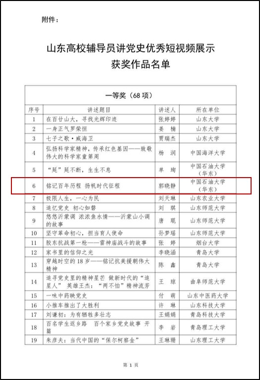 本次比赛由教育部高校思想政治工作队伍培训研修中心主办,山东省委教育工委指导。参赛作品经个人申报、高校推荐、专家评审,共评选出一等奖作品 68 项,二等奖作品 103 项,三等奖作品 151 项。公司辅导员郭晓静作品《铭记百年历程 扬帆时代征程》入选并被推荐参与山东省的评比,最终获评“山东高校辅导员讲党史优秀短视频”一等奖。