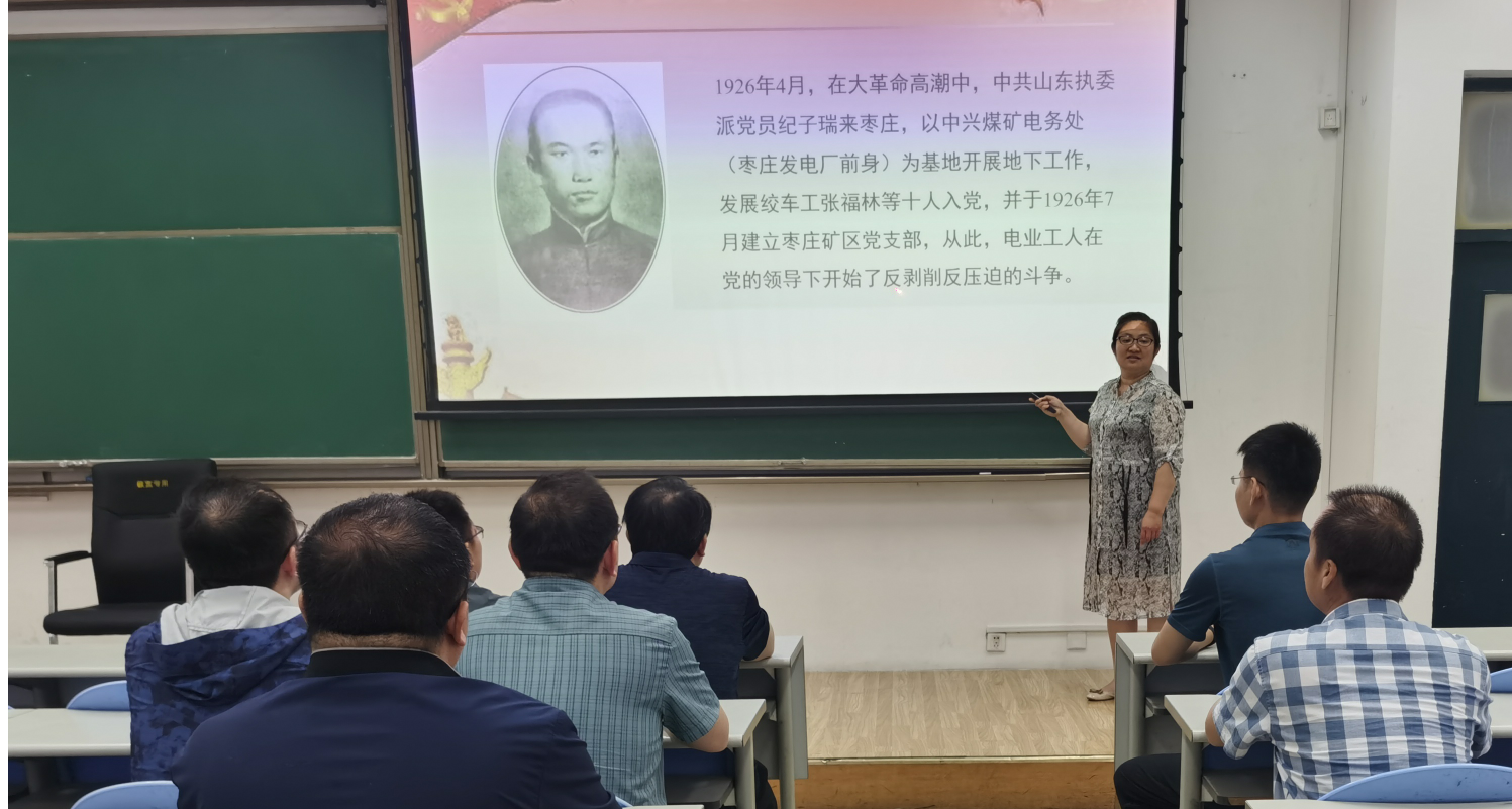 张丽霞基于山东电力发展史,结合生产实习单位党建资料,为党员教师讲述了老一辈党员们,在山东电力发展的历程中,即使抛头颅,洒热血,身陷囹圄也要革命到底的无畏精神和家国情怀。党课包括四部分的内容:一、中国百年煤史的悲惨回忆;二、电业工人反剥削反压迫的斗争;三、新中国成立以来鲁中电业局的成立和发展;四、新能源时代山东电网的光辉历程。