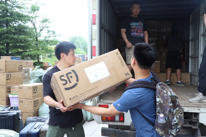 早8点,搬迁用货车及大巴车全部到位,员工包裹运到宿舍楼下固定区域后开始装车。行李全部装至货车后,员工分别坐上四辆大巴车,待全部就绪后一同发车。上午11点左右,全部车辆及人员到达古镇口校区,并进行卸车。