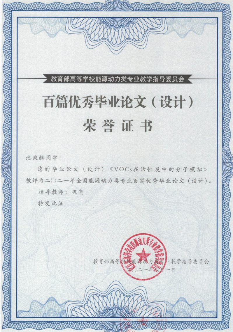 8月28日,教育部高等公司能源动力类专业教学指导委员会主办的首届(2021年)全国能源动力类专业优秀本科毕业论文(设计)展示交流活动在山东大学落下帷幕。公司能动1702班池爽赫同学的毕业论文《VOCS在活性炭中的分子模拟》被评为全国能源动力类专业百篇优秀毕业论文(设计),论文指导教师为巩亮教授。