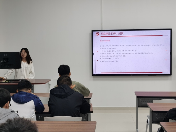 班长李广焕首先指出此次班会的主旨为爱国爱党教育,并对此次班会的主要内容进行介绍。为发挥党员模范带头作用,此次班会由班内几位党员同学进行轮流宣讲。会上,党员翟凯淼首先介绍中国共产党的光辉历程以及发展的标志事件,解释红船精神、长征精神等的深刻内涵,号召同学们向革命先辈学习。接下来,党员刘鹏对老员工如何入党进行宣讲,并对入党的几个关键流程进行详细的介绍,指出入党关键是心怀赤诚以及努力奋斗。随后,党员何金珊分别从政治、经济、军事、科技、体育五个角度分享了国家建设过程中的伟大成就,并就同学们感兴趣的方面作了细致的讲解。最后,团支书王昊对新时代下党和国家对我们提出的新要求作了汇报,勉励同学们坚定理想信念、坚持知行合一、积极强身健体,为构建人类命运共同体奉献青春力量。