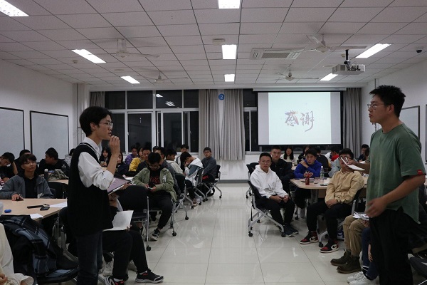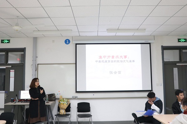 讲座伊始,吴尚泽介绍主讲人张会芸副教授。随后张会芸以戴口罩为切入点,展现中美抗疫的政治文化差异,她谈到:美国的特点是“上层不统一,基层不服从,民众不服从”,而中国是“核心决定政策,基层贯彻实施,国民万众一心”。她以视频和亲身经历为例生动形象地介绍出中美文化差异,通过对比展现出当代中国制度在疫情下的优势。讲座结束后,吴尚泽邀请在场员工举办了一场以“英雄造时势还是时势造英雄”为辩题的友谊辩论赛。来自过程装备与控制工程2101班以及能源与动力工程2102班的八位辩手就此辩题进行了一场激烈的辩论,两队据理力争,互不相让。活动结束后,来自能动 2103班的唐睿同学感慨说道:“张会芸老师的讲座让我们对中美政治文化差异有了进一步的认识,对党的制度更加自信。辩论赛中双方辩友的精彩发言,让我切身感受逻辑与脑力的碰撞。赛中选手优秀的语言也给我留下了深刻的印象,激励着我积极进行思考。”