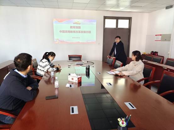 会议首先由王新伟老师做题为《教育强国—中国高等教育改革发展历程》的微党课,回顾了我国高等教育自建国以来的改革发展历程。70多年以来,我国高等教育经历了数次调整:配合国家“一五计划”,1952年到1957年开展院系大调整;1977年恢复高考,炸响了改革开放的第一声春雷;1998年高校扩招,更多的人获得了上大学的机会;党的十八大以来,考试招生制度改革、“双一流”、振兴本科教育……一批标志性、引领性的改革举措成效凸显。我国高等教育扎根中国大地,为国家图富强,为民族谋复兴,为社会育人才,始终与共和国同向同行。