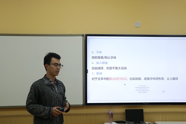会议伊始,白思源从“文字要求”“图片要求”两个方面向大家传授如何撰写一篇推文。首先他从文字要求展开讲解,他强调了推文中对字体、字号、段落格式的具体要求,并结合往期推文为大家现场展示如何调整文字才能使推文更加美观。随后,他对推文的图片要求也展开详细描述,对图片大小、文字标注等要求做出介绍,并指出推文中的注意事项及常见错误。随后,崔海胜上台为大家介绍编辑推文的常用软件及具体方法,并带领大家一起制作一篇简易推文以帮助大家更好的熟悉理解制作推文的具体步骤。会议结束后,青年之家综合事务中心薛雨欣表示:“在此次推文培训讲座中我了解到了制作一篇推文的详细步骤及相关要求,对如何制作一篇完整推文有了大致了解。”