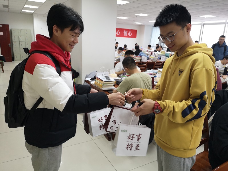 活动伊始,尹宏对考研学子一直以来的辛苦付出表示肯定,并询问员工们的复习状态,鼓励大家树立信心,把握好最后的冲刺阶段。尹宏说道:“希望你们充满理想、坚定信念,将考研坚持到最后,同时注意劳逸结合、调整心态,以最好的状态迎接考研。”随后,尹宏及员工代表为每一位考研学子送上精心准备的小礼品。考研员工能源与动力工程专业1802班韩子轩表示:“今天的图书馆格外温暖,感谢公司、老师和同学们的关心,小小的礼品袋给了我们考研员工很大的精神帮助和鼓励,我们一定加倍努力,一‘研’为定,不负众望,以优异成绩回报公司关怀!”