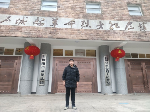 陈锦豪事先搜集了赣州市和石城县的县志资料进行学习,走访了当地一些党员、干部,了解到赣州市在中国革命史上的特殊地位,并结合互联网了解到石城县的所有革命教育基地。其中,石城县革命纪念馆和烈士陵园长期对游客开放。在纪念馆工作人员的带领下,陈锦豪参观了纪念馆内陈列的战士雕塑、油画以及先辈使用过的枪支弹药。在烈士陵园内,陈锦豪缅怀英雄,记录英雄事迹。通过阅读陵园内的石城阻击战碑碑文,其中,令队员感触最深的包括:七根火柴故事原型、英雄陈尚发、英雄耿凯等,队员陈锦豪了解到石城阻击战和五次反围剿斗争的重要意义,以及苏区人民紧紧的团结在中国共产党与红军周围,与国民党反动派斗争的艰辛岁月。