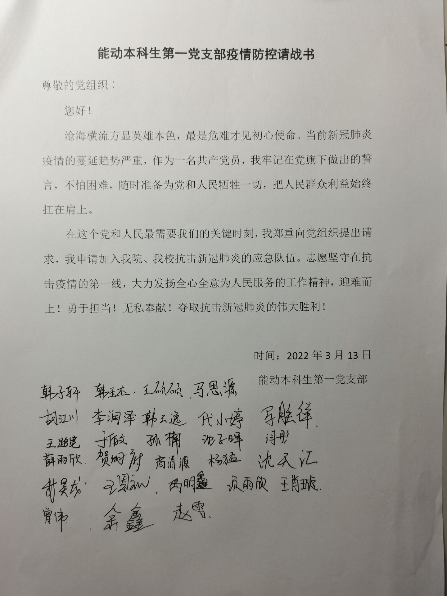 能动本科生第一党支部请战书