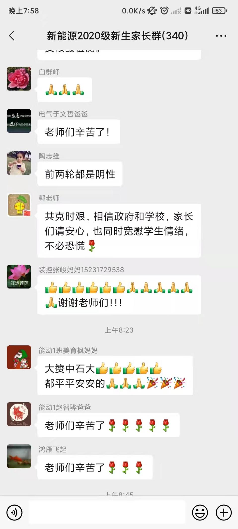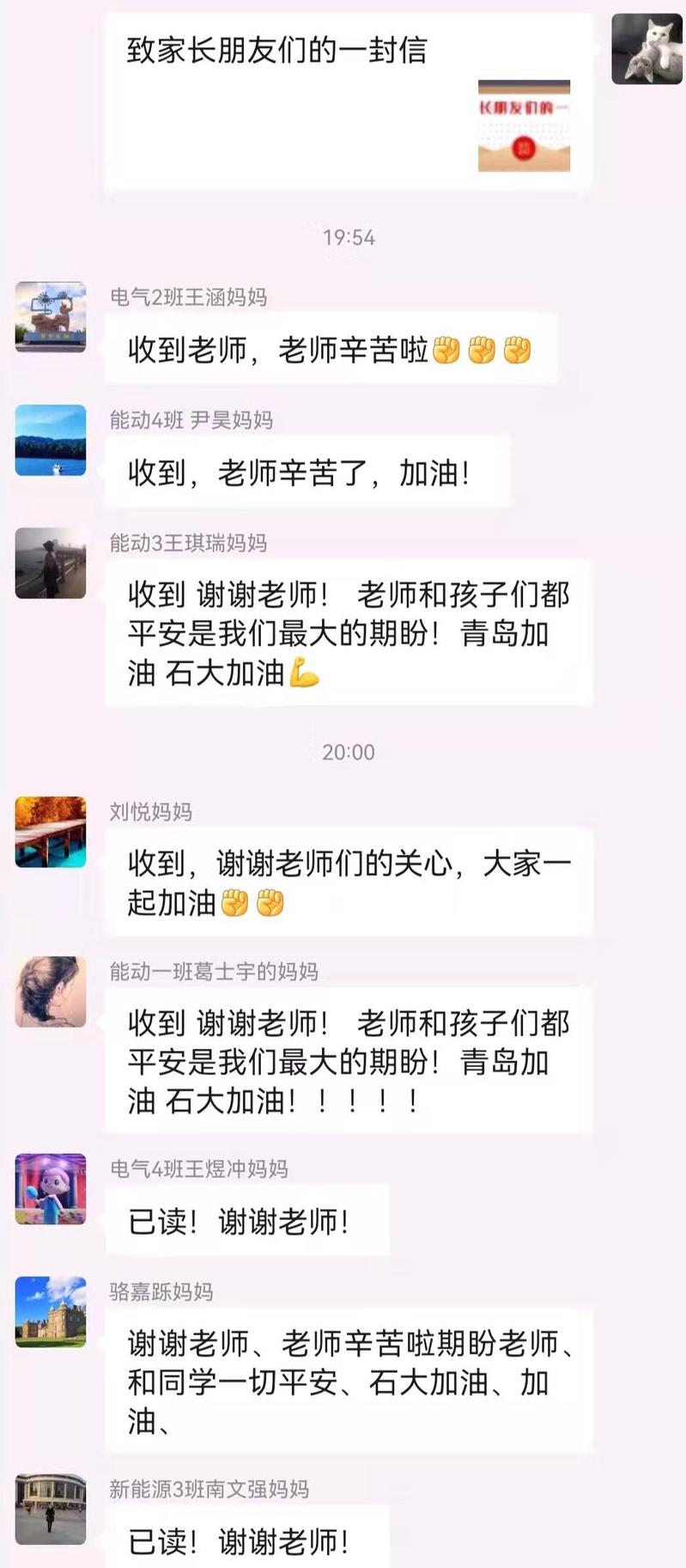 “感谢医护人员的付出!感谢石大!”“老师和孩子们都平安是我们最大的期盼!青岛加油,石大加油!”“辛苦老师!同心抗疫,定能战胜疫情!”……近日,校园疫情防控引起了各位老师、家长的广泛关注,留下了一条条暖心留言。