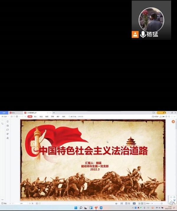 为坚定理想信念,提高党员的政治素质和思想水平,3月30日,公司能动本科生第一党支部开展线上组织生活,本次会议的主题是学习中国特色社会主义法治道路。会议由党支部书记曾伟主持,以线上腾讯会议的形式进行,支部全体党员参与。