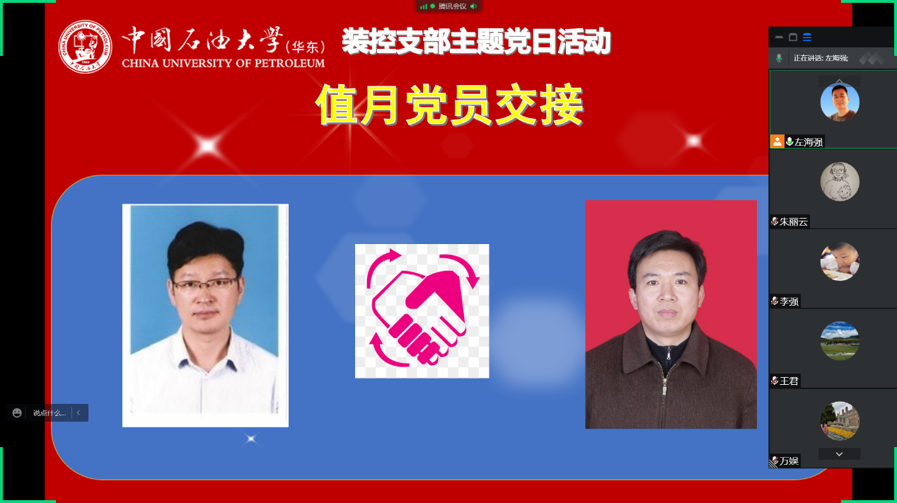 最后,本月值月党员刘兆增和下月值月党员赵延灵老师进行了交接。