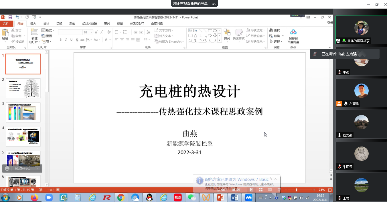 首期由左海强、齐建涛、曲燕和刘文强四位老师进行课程思政教学案例设计分享。左海强老师以《过程设备设计(2-2)》思政育人案例设计为题进行介绍,课程绪论部分引入习近平总书记2021年10月21日在视察胜利油田时的讲话:“能源的饭碗必须端在自己手里”鼓励同学们努力学习本领,以科技创新开发石油化工高端装备,提升石油能源利用效率,高质量端好能源的饭碗。在存储设备章节将国家战略石油储备如何服务国家能源安全等思政元素有机融入课堂教学。齐建涛老师以《管道安装设计》思政育人案例设计为题进行介绍,课程中将大连新港“7·16”石油管线爆炸救援中的消防战士桑武冒着生命危险毅然冲入爆炸不断的火场中心,忍着灼烧的剧痛徒手将阀门转了32000圈最终关闭泄漏原油的储油罐阀门,创造我国火灾扑救史上的奇迹这一案例有机融入课堂教学。曲燕老师以《传热强化技术》思政育人案例设计为题进行介绍,课程中将中国力争2030年前实现“碳达峰”, 2060年前实现“碳中和”,鼓励同学们抓住新能源变革机遇,永葆“热”情,攻坚克难,建功立业这一思政元素有机融入课堂教学。刘文强老师以《化工装置经济》思政育人案例设计为题进行介绍,课程中将中国石油化工发展历史、一带一路等思政元素有机融入课堂教学。四位老师的分享给了老师们很大启发,其余老师也对四位老师讲解的思政育人案例中如何更好的融入思政元素提出了更多有价值的建议。
