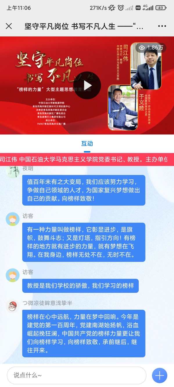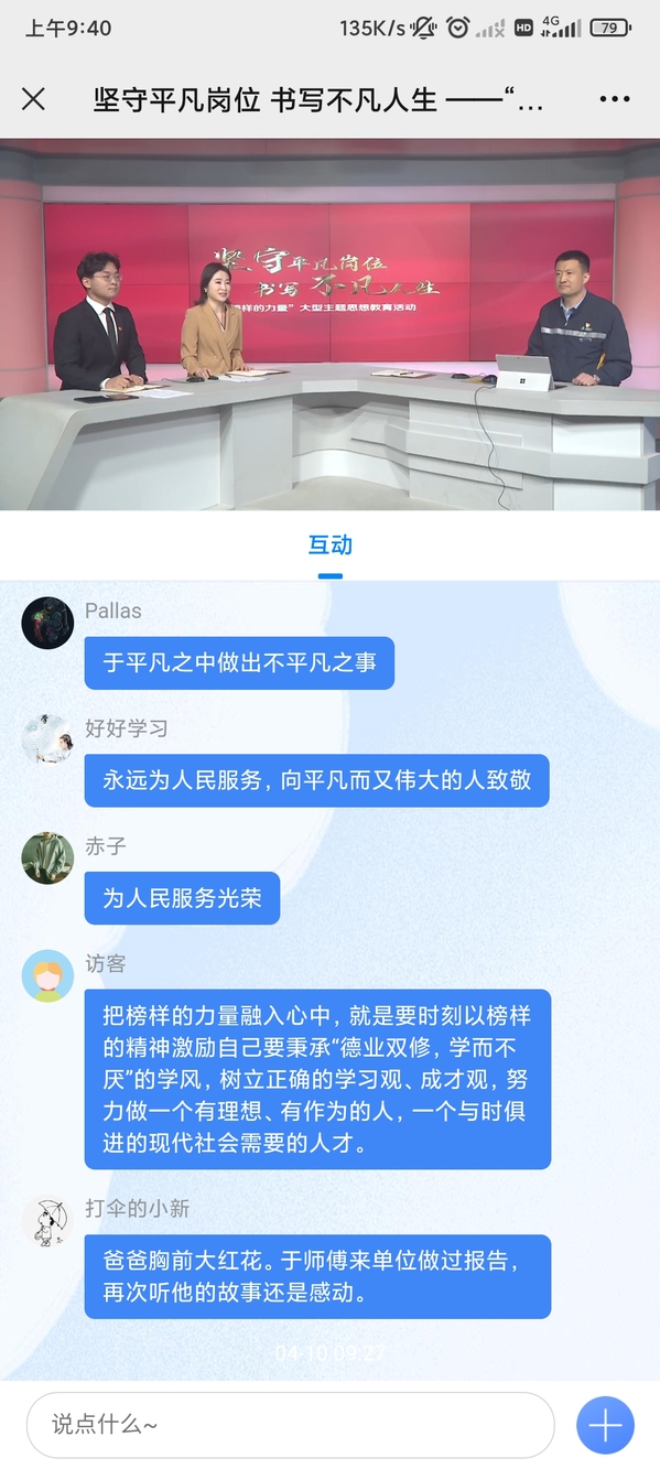 直播过程中,收到来自社会各界人士的广泛回复。网友“优秀”留言:“朴实之中见精神,平凡之中见伟大;榜样的魅力让我们见贤思齐;榜样的情况让我们倍感温暖;榜样来自平凡,就在我们身边。”网友“夜明”说:“值百年未有之大变局,我们应该努力学习,争做自己领域的人才,为中华民族伟大复兴的中国梦作出自己的贡献,向榜样致敬!”
