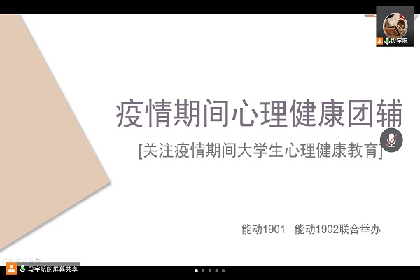 为提高班级凝聚力,在疫情的背景下加强联系与交流,并引导员工在疫情防控期间积极调整心理状态,5月9日,能源与动力工程1901班、1902班联合开展线上心理健康主题团体心理辅导活动,此次活动由能动1902班心理委员段宇航主持,能动1901班和1902班全体成员参加此次活动。