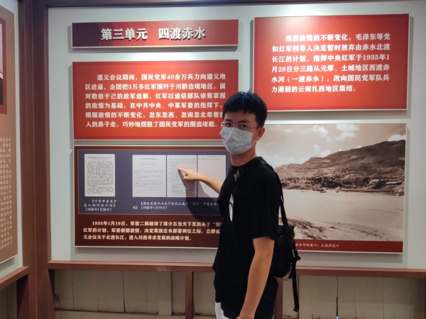 活动伊始,实践队员们于会址门口集合并合影留念,进入红军总政治部及警备司令部旧址,由实践队员韩映雪对旧址中陈列的红军雕塑,历史介绍展板进行了拍照留念。随后,实践队前往邓小平住处,参观了解到住处分为邓小平住室,潘汉平住室,黄汉镇住室。在讲解员的带领下实践队紧接步入遵义会议陈列馆内,对展示的遵义会议室挂钟,红军军旗,红军标语等大量藏品进行了摄影留念并对其背后的历史精神进行学习与讨论。在游览结束后,队员游麒麟表示:“大家通过图片参观和讲解员讲解等方式参观了遵义会议会址陈列馆,重温中国革命发展的艰难历程,了解了长征路上红军所经受各种严峻考验的故事,更因深感革命精神的思想伟力,深刻感受到中国革命胜利的来之不易,我们理应激发出更加充沛的奋斗精神”。活动最后,实践队全体队员在会址前庄严宣誓。实践队队员纷纷表示,参观遵义会议会址使每个人都受到一次荡气回肠的思想洗礼,有了新的感悟,鼓舞着青年继承和发扬党的优良作风。