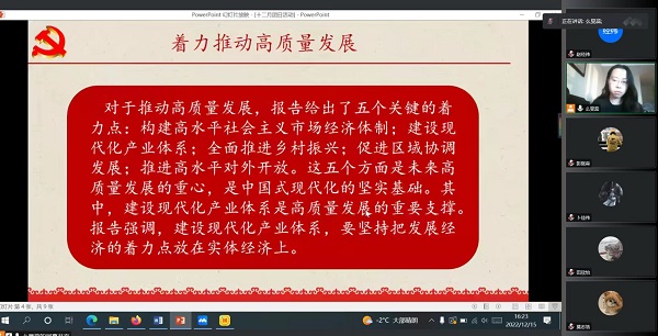 活动伊始,么旻蕊对党的二十大召开情况进行了简要概述,并对着力推动高质量发展的具体措施进行详细阐述。随后,么旻蕊从“构建高水平社会主义市场经济体制”“建设现代化产业体系”“全面推进乡村振兴”“促进区域协调发展”“推进高水平对外开放”五个方面着力点系统论述了党的二十大报告中对着力推动高质量发展的关键要求。随后,么旻蕊从坚持正确的人生道路,练就过硬本领,发扬永久奋斗的传统三个方面的具体做法,阐述了如何成为有理想、肯担当的新时代好青年的具体要求。随后,本次团日活动举行有关二十大精神的知识竞答,鼓励青年团员们积极参与回答,让青年团员对于二十大精神有了进一步了解。活动过程中,么旻蕊为与会人员播放有关二十大的视频,回顾党的百年奋斗的光辉历程。彭庭森感叹道:“我们青年应树立远大理想,将实现个人价值目标与时代目标紧密结合,在青春岁月中挥洒汗水,实现人生价值。”