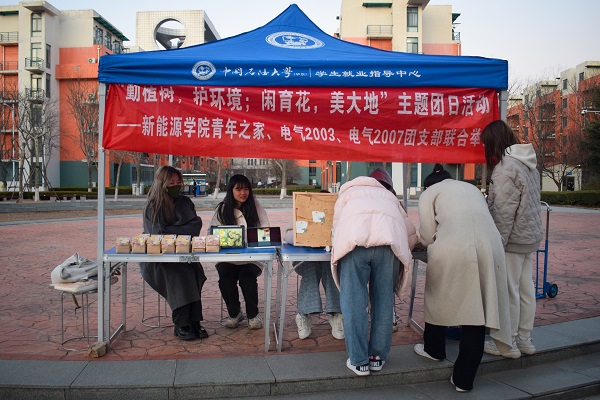 在为期一周的准备工作中,青年之家成员与支部成员相互配合、紧密联系,共同做好活动策划、人员安排、奖品制作以及场地申请等基本工作,以保证当天团日活动正常开展。活动于荟萃广场西侧如期举行,马艳雨向在场员工进行植树节相关知识的宣传,她从植树节的节日起源、节日活动以及节日意义等方面做详细介绍。随后,杨子钰引导在场员工参与植物种植实践体验,并通过开展知识问答或植树节相关留言等方式换取花卉种子,“每一次播种都是深耕的开篇,每一棵幼苗都是未来的希望”。此次活动累计发送130余包花卉种子,包含波斯菊、洋桔梗、风铃草等绿植。