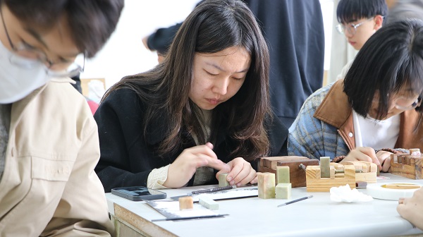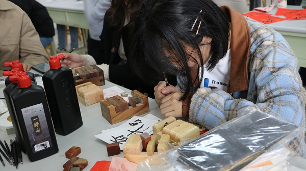 活动围绕“篆刻”开展——参与者将用刻刀,雕刻自己的刻石,在篆刻中感受传统篆刻艺术的魅力。活动伊始,翰墨飘香书画社篆刻部成员文奥为参与活动的员工讲解篆刻文化的历史。随后,文奥指导员工如何篆刻,他以“阴文印”为例,对刻刀的用法进行教学,鼓励员工大胆实践,并耐心指导员工进行篆刻创作,希望员工能够在动手实践中加深对篆刻艺术的理解。翰墨飘香书画社成员严子昕表示,篆刻艺术源远流长,是中国文化中不可或缺的一部分,希望员工能够多了解、多学习篆刻技术,积极发扬篆刻文化。随着参与人数的增多,志愿者倡议员工在白纸上盖下印章,保留下自己的篆刻成果。完成后志愿者将众人作品挂起,这一过程旨在展示活动成果,并对参与员工的作品表示肯定,给予员工创作的信心。参与员工姚遥说到:“这次篆刻体验活动简单易上手,让我在自主创作的同时体会到篆刻艺术的有趣,希望以后还能参与相关系列活动。”