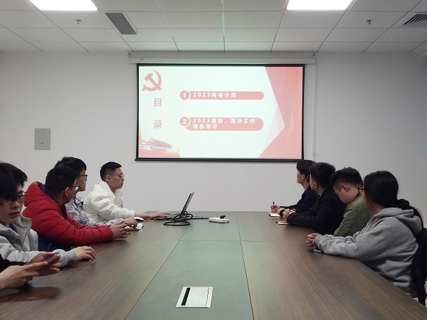 会议伊始,谷宇成同志向党支部全体成员做了《2023两会重要精神学习》的主题汇报。首先,谷宇成同志结合2023年政府以及政协工作报告,带领大家了解过去五年里的主要工作成果,使在场党员深刻认识到,在党中央的坚强领导下,我国完成了经济发展再上新台阶、脱贫攻坚任务胜利完成、科技创新成果丰硕、经济结构进一步优化等成就。其次,谷宇成同志依次向大家介绍了2023年我国的工作重点是着力扩大国内需求、加快建设现代化产业体系、切实落实“两个毫不动摇”、更大力度吸引和利用外资、有效防范化解重大经济金融风险、稳定粮食生产和推进乡村振兴、推动发展方式绿色转型以及保障基本民生和发展社会事业。随后,在场党员集体观看了2023《全国两会特别报道》短片,通过倾听代表委员们的两会感受,进一步了解两会内容,学习两会精神。最后,谷宇成同志总结道:过去五年,是极不平凡、极不寻常的五年,我国发展取得的成就,是党中央坚强领导,习近平新时代中国特色社会主义思想科学指引以及全党全军全国各族人民团结奋斗的结果。支部书记王子阳也勉励大家:我们要更加紧密地团结在党中央周围,砥砺前行,通过学习与工作积极推动经济社会持续健康发展。