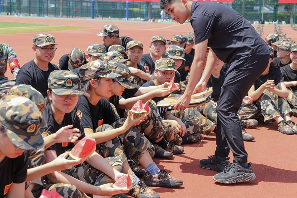 在阵阵响亮的军训口号声中,全营昂首站立,等待接受检阅。随后,各领导老师慰问全体军训教官并发放慰问品。郭杰向承训教官致以问候,并向全体军训员工提出了三点期望和两点要求,希望大家通过军训锤炼本领、增进感情、增强集体荣誉感,要求在接下来的军训过程中,全营成员端正态度、听从指挥,展现新能源学子的良好风采。最后,各系教师代表向本专业员工发放西瓜等慰问物资,并与员工亲切交谈,耐心解答员工对于各自专业发展方向以及就业前景等相关问题。