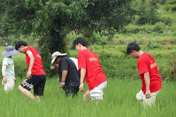 上午,实践队来到位于大别山脚下的大庙基地参观了水稻种植区。此基地三面环山,形成了一个天然的隔离带。同时此地的山泉水也成为水稻天然的灌溉水源,为自然农法种植水稻提供了优良的环境条件。在基地中,实践队先跟随“丰收哥”参观了水稻试验田,看到了鸭糯、三香牛奶、胭脂稻等珍稀品种。“丰收哥”告诉实践队员:这些珍贵的水稻品种是从全国各地搜寻,经过试种,验收口味、产量等各方面指标,以确定是否大面积种植销售。随后,实践队员在种植部工作人员的带领下体验除稗草:下水田、辨别稗草、拔除稗草,实践队员亲身体会到自然农法对种植过程的要求之高,也对自然农法的内涵有了更加深刻地了解。