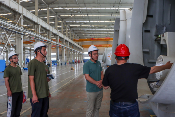 8月17日上午,实践队到达河北张家口市张北运达风电有限公司交流学习,运达股份张北公司总经理张英波、张北公司制造中心生产主管夏晓博、张北公司综合管理部经理闫晓霞、运达股份资源开发部刘其学、张志远带领实践队员参观风机厂房,并座谈探讨风电发展的现状及革新问题。张英波介绍,随着科技的进步,成本迭代加快,风电机组成本大幅度下降,在风力发电的过程中,由于不同地区间资源不同,工业性不同,用电量负荷有所区别,风力发电的能力和技术壁垒是不同的,目前,我国风力发电以陆上风电为主,同时大力发展海上风电,并配套储能技术,极力解决风电安装运行、发电不稳定等难题,推动风电行业助力“双碳”目标。