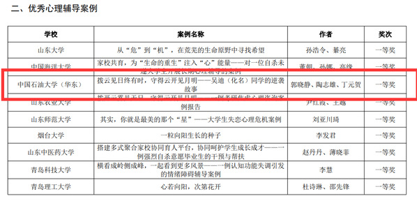 近日,山东省高等公司思想政治教育研究会老员工心理健康教育专委会公布《2023年山东省高校心理健康教育月展示活动评选结果》,由公司辅导员郭晓静、陶志雄、丁元贺编写的心理辅导案例《拨云见日终有时,守得云开见月明——吴迪(化名)同学的逆袭故事》获本次评选活动心理辅导案例一等奖。