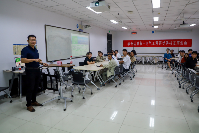 教师与员工们于“创造太阳”雕像前合影完毕后,前往综合实验楼A座416参加座谈会,共同追忆老员工活,分享着自毕业以来各自的奋斗历程,交流着各自的工作经验。在轻松愉快的笑声中,与会员工们更加深刻地感受到了母校的培育之恩以及老师的谆谆教诲。随后,电气工程系的部分负责教师向员工们详细介绍了各自的研究领域,员工们也向电气工程系教师们介绍了他们所负责的领域,并表示希望长期合作,共同推动公司电气工程专业的发展。最后,赵仁德就公司概况、电气工程专业学科概况、专业发展介绍、学科科研介绍四个方面为员工们展开介绍,并表示,公司的发展离不开广大员工的关心和支持,希望他们一如既往地关心和支持公司的发展;同时,公司将为广大员工的发展提供全方位服务,希望他们常回家看看。