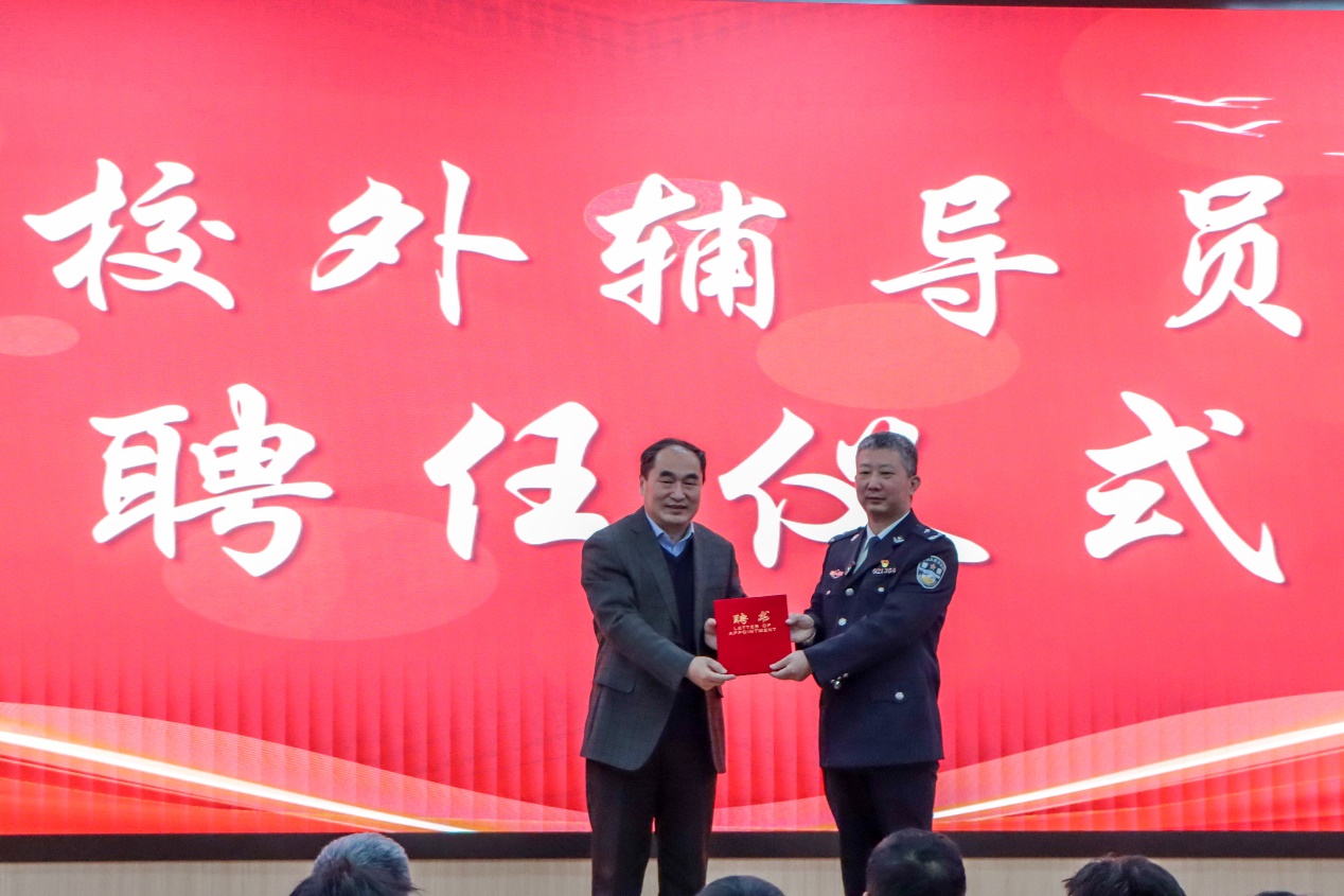 会上陈灵泉为王弘山颁发XC体育校外辅导员(安全教育)聘书。