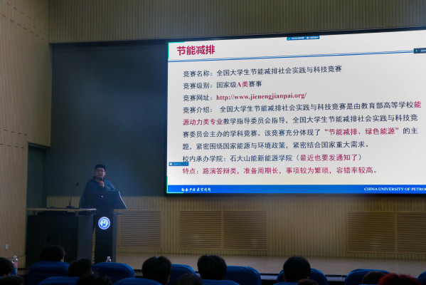 全国老员工节能减排社会实践与科技竞赛特等奖获得者李蕴达向员工们简述竞赛的内容、赛程、比赛形式及评审标准,并以问题汇总的形式回答如何参赛、如何组队及联系指导教师、如何备赛等问题,并给出参赛的时间规划。李蕴达表示大二、大三是参加比赛的黄金期,鼓励大家理性看待、权衡好利弊后积极参赛。