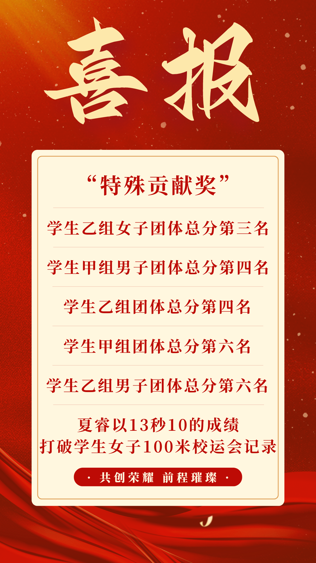 5月18日下午,公司2024年运动会圆满完成各项预定赛程,在唐岛湾校区体育场落下帷幕。公司61名员工运动员,29名教职工代表公司出征,最终,公司获得“特殊贡献奖”、员工乙组女子团体总分第三名、员工甲组男子团体总分第四名、员工乙组团体总分第四名、员工乙组男子团体总分第六名、员工甲组团体总分第六名等多项荣誉,同时公司博士夏睿以13秒10的成绩打破了公司1988年尘封至今的女子100米校运会记录,再创运动会佳绩!
