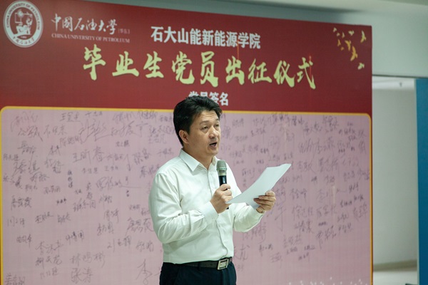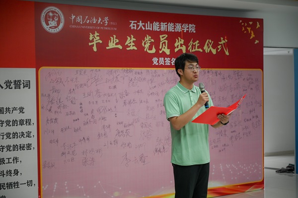 随后,本科生毕业生党员代表张鸿强与研究生毕业生党员代表陈晓凡代表全体毕业生党员发言,他们对领导、老师四年来悉心教导与精心栽培表示衷心的感谢。回顾过去四年的成长历程,展望未来的新征程,他们代表全体毕业生保证,未来将充分发挥党员的先锋模范作用,以实际行动践行石大精神,坚定理想信念,努力成为堪当民族复兴重任的时代新人。