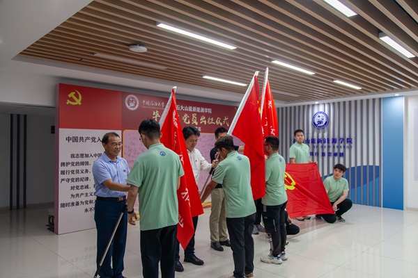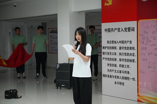 吴明铂、郭杰、张洪泉为2024届毕业生优秀党员代表新能源2001班高彦文、能动2003班德勒多吉、环设2002班高晓授旗,开启人生下一个阶段。授旗结束后,在场老师为所有党员郑重佩戴党徽,一枚党徽寄托着公司对毕业生的殷殷嘱托和无限期望。全体毕业生党员站在党旗前庄严宣誓,重温入党誓词,一字一句都深深印刻在每位党员心中,作为指引前行的灯塔。