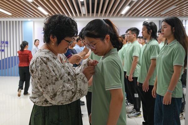 张丽霞为员工佩戴党徽 王奕栋摄