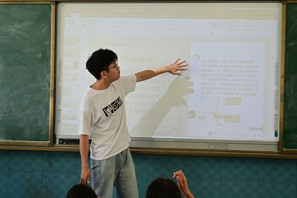 “了解历史才能看得更远,理解历史才能走的更远。”支教队员们坚信以史为鉴,开创未来,开展多种历史有关课程。队员石博从纵向历史发展顺序,给员工们讲述整体的历史发展,加强同学们对于整体历史观的把握;队员黄卫宇从数学文化的角度出发讲述数学历史,在培养同学们数学思维的同时开拓了同学们的眼界;队员朱公琎以新媒体的形式展开,从短剧《逃出大英博物馆》中汲取灵感,借助优秀短剧,从文物的角度讲述过去一段屈辱的历史,让同学们用耳朵倾听真相的呐喊,以至用眼睛洞察正义的方向,用脚步丈量和平的未来。