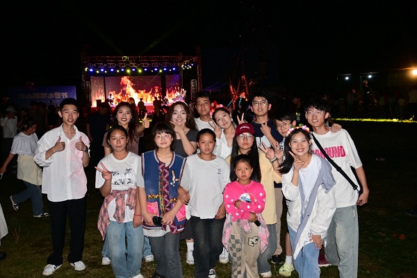 热情火把,篝火人间。通过第一天的师生破冰游戏,和结合时事打造的一系列特色课程教学,支教队成员已与当地员工建立了相对稳定的联结关系。7月29日晚七点,果珠纳支寨火把节篝火晚会于云南省昭通市镇雄县果珠乡高坡村正式开幕,为促进师生交流,厚植民族情怀,彩云青藤实践队带领上湾员工们一同前往。草坪中央的篝火火焰舞动着如同生命的奔流,茕茕热浪,火屑飘扬,队员们与当地彝族人民一起手拉手,以火之名、与火共舞、同火狂欢,肆意挥舞雄姿,享受当地特色美食。是夜,果珠彝乡的火把点燃激情、点燃友谊、点燃民族团结进步的主旋律。“烟火中的热烈与浪漫,让下着小雨的黑夜如此热情而明亮,我们手牵手在火焰中围圈舞蹈,‘民族一家亲’的画像在那个时刻变得如此明晰。”支教队员王佳倩有感而发。